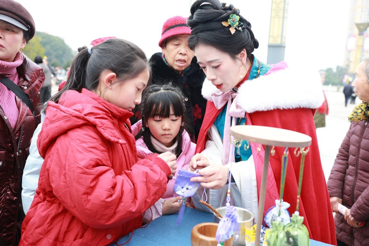 中药香囊制作区人气最旺,身着传统服饰的工作人员手把手指导居民制作兰冰香防感专属香囊。藿香、艾叶、菖蒲等十余味中药材研磨成粉,装入精致囊袋,阵阵药香沁人心脾。工作人员详细介绍,香囊通过芳香药物的气味刺激,可增强人体免疫力,起到预防感冒、安神助眠的作用,尤其适合妇幼人群。